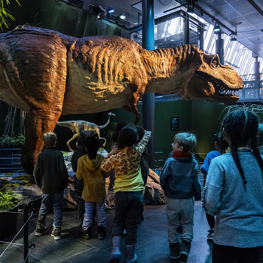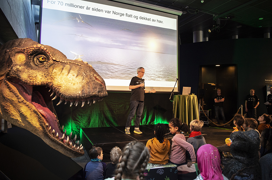Utstillingen er et publikumsfrieri, sies det i pressemelding fra Oljemuseet, men byr samtidig på en dypere fortelling om jordens historie – der dinosaurer vandret omkring samtidig som de kjente olje- og gassfeltene Ekofisk, Snorre og Troll fikk avsatt sine reservoar.